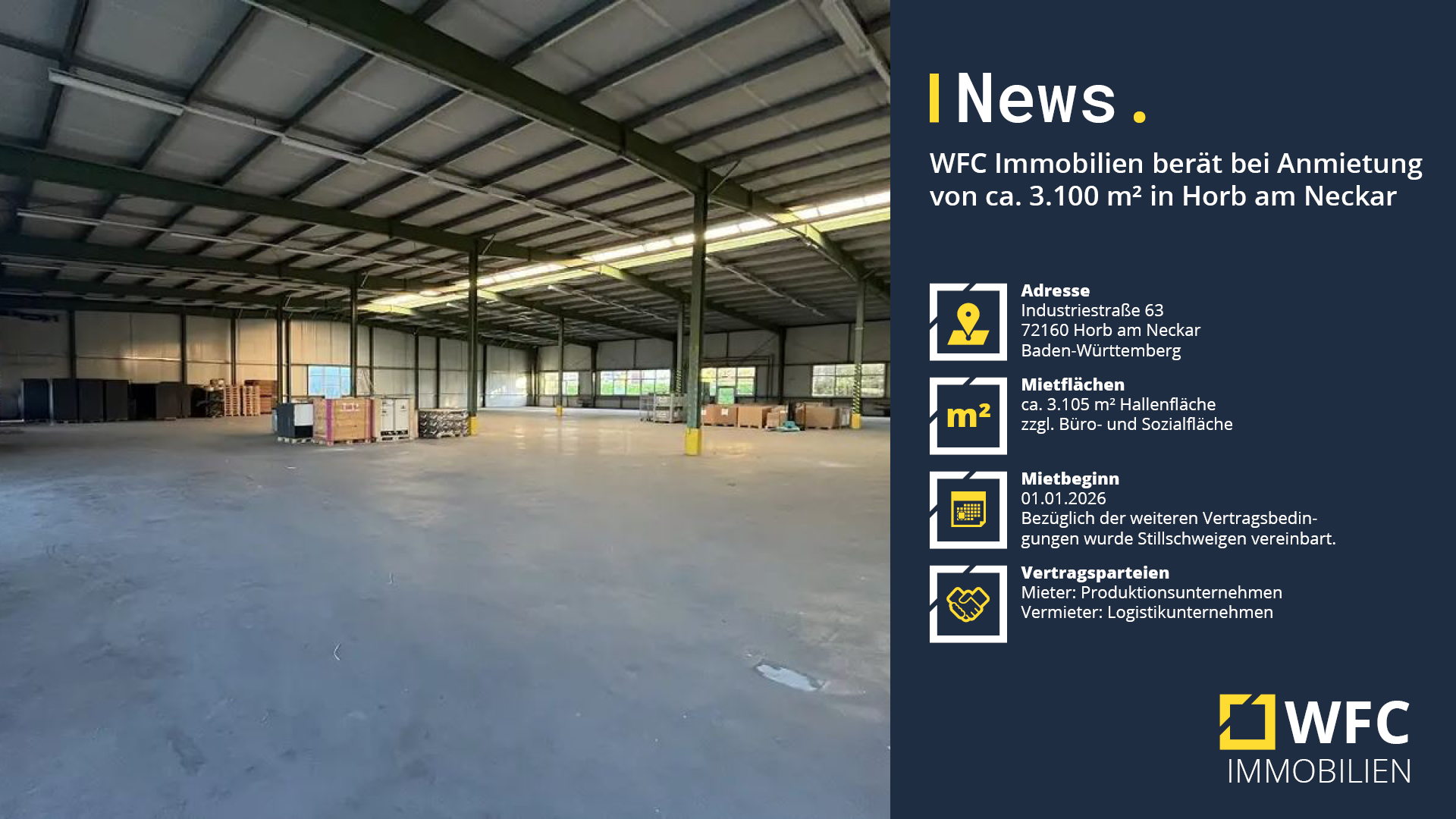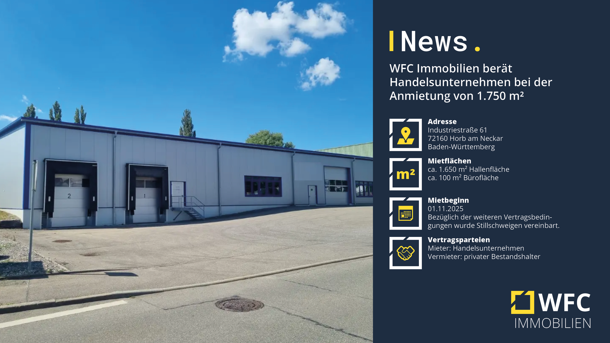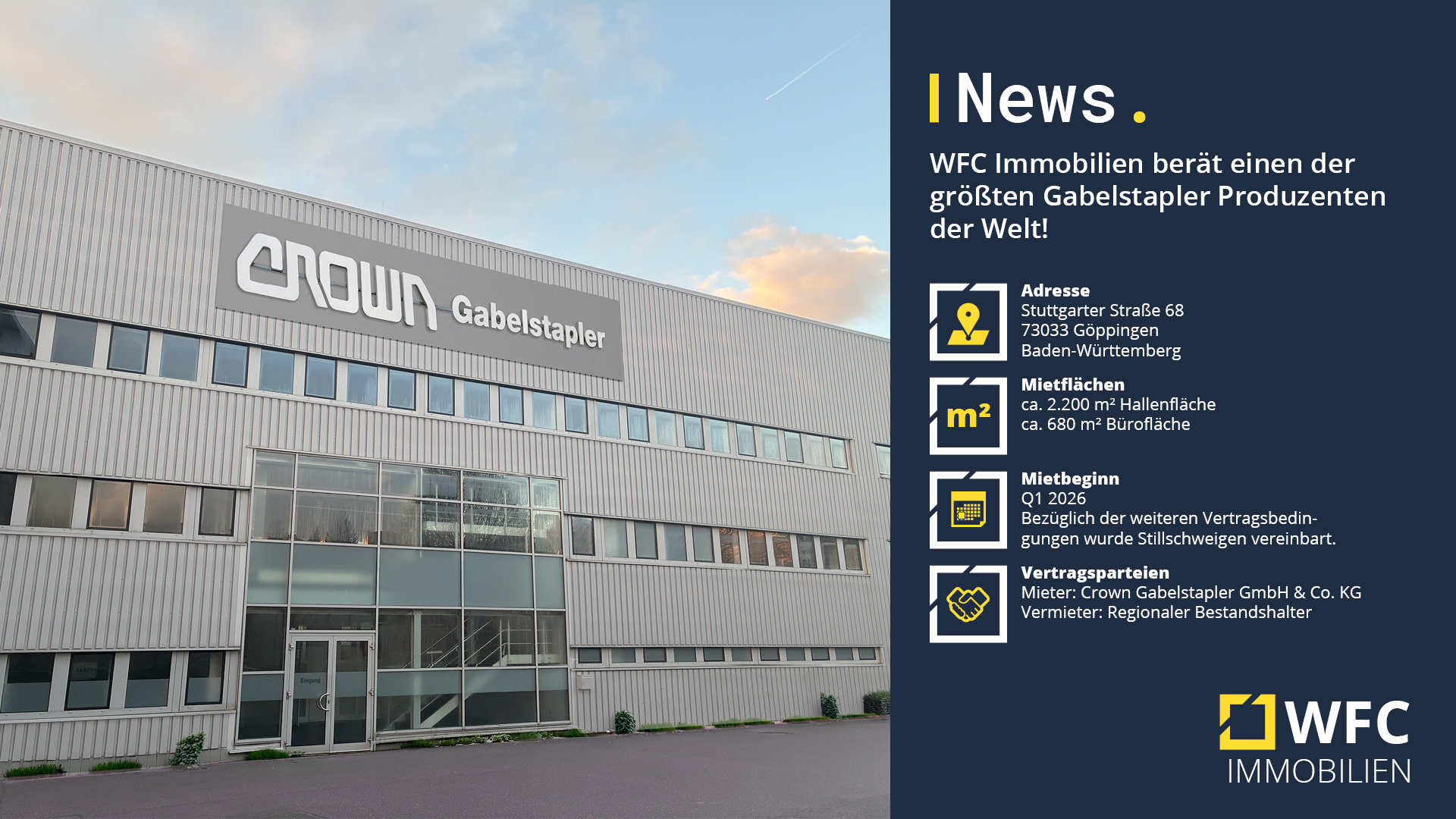 WFC Immobilien war beratend und vermittelnd tätig. Der Eigentümer der Liegenschaft ist einer der größten Bestandshalter im süddeutschen Raum. Die Flächen wurden langfristig angemietet. Mietbeginn war bereits der 01.07.2025. Über alle weiteren Vertragsdetails wurde Stillschweigen vereinbart.